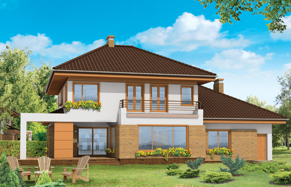 Sweet house plan is a charming, two-story house for a family of 4-6 people. The building was constructed by combining storey residential part of the ground floor and the attic of built another garage. In this house roofs, balconies, terraces and pergolas are a variety economical of body. The division of the garage walls of the house on two horizontal stripes visually lowers storey house silhouette. The interior of house is a single-space ground floor, with living room, dining room and hall. On the first floor was designed bedrooms. On the ground floor we managed to save an extra room that could serve as an office or extra bedroom. On the ground floor there is also a garage and technical rooms. On the floor above the garage it resulted in a large space for any design. Especially charming in this project is roofed terrace with large glass of the dining room and living room - it is a smooth transition between the interior and the garden. There is also available mirror version of this house plan.