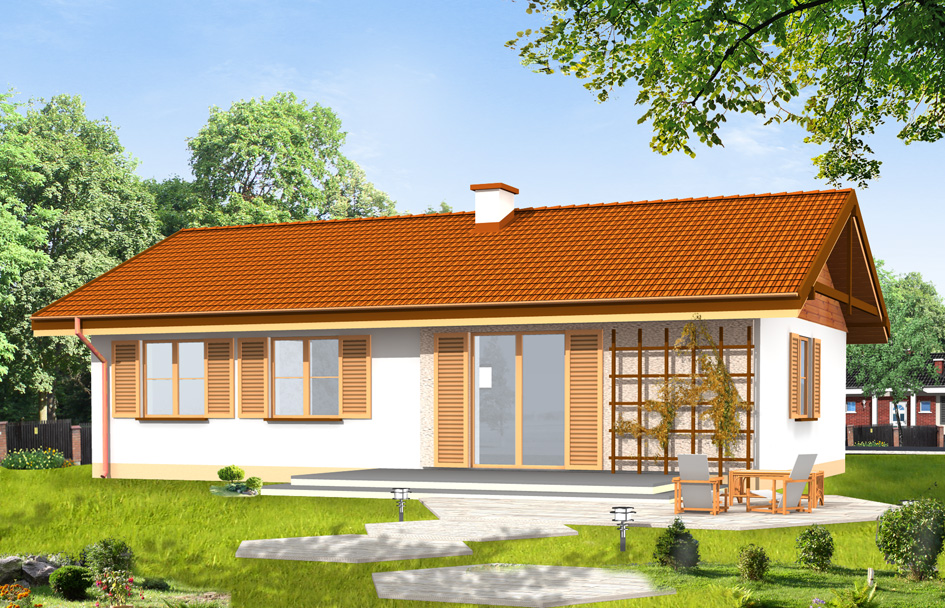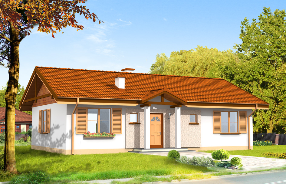Sunny is storey, single-family villa for a family of four. Building of simple block , easy and inexpensive to build. Living room connected spatially with lounge, dining area and partially open kitchen create a large single space, spacious interior. In Sunny bedrooms with bathroom and separate toilet together make up the night part of the house. Exterior appearance of Sunny is unpretentious detail and well-balanced proportions. We has a variant versions of the Sunny e.g. with garage and hipped roof. There is also available mirror version of this house plan.