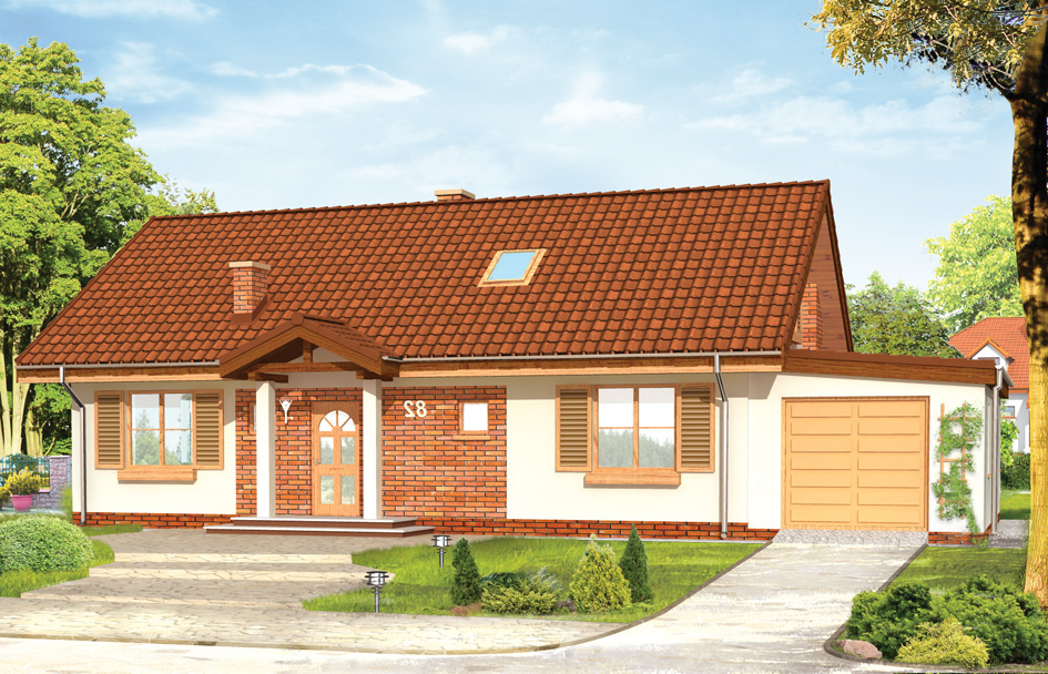 Sunny house plan with an attic is a version of Sunny with the lifted roof. Thanks to this in the project foresees an attic to adapt to a usable attic. On the ground floor besides a living room with spatially hall and kitchen, three bedrooms, utility room, was designed a garage with a boiler room. Above the ground floor was designed attic, which in the second stage of building a house can be used as a loft with two bedrooms and a bathroom. Then, in place of the pull-out folding steps should be planned in the lobby with stairs to the attic. Architecture of the building: unpretentious, simple and economical in expression in the detail. Simple design of Sunny house with an attic allows for economical and easy construction. There is also available mirror version of this house plan.