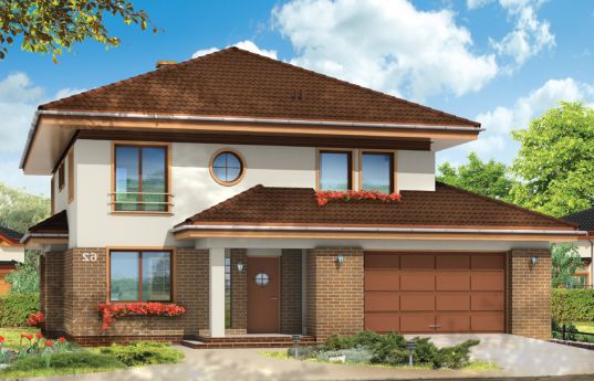 Sonnet is elegant storey villa, with a shape of rectangular block, with the garage with a cut from the side and covered by small roof. The division of the elevation into horizontal stripes visually lowers the building, which seems to be closer to human scale. Arcades - entrance and garden, dining room, bay window, round window in the front elevation - add variety to the silhouette of the house. Sonnet interior is designed in such way to divide villa in the living space on the ground floor and night on the first floor. On the ground floor an extra room with bathroom, garage and boiler room was also designed. House despite the small size is very roomy and functional, has many rooms and auxiliary rooms. There is also a mirror version of the Sonnet house plan.