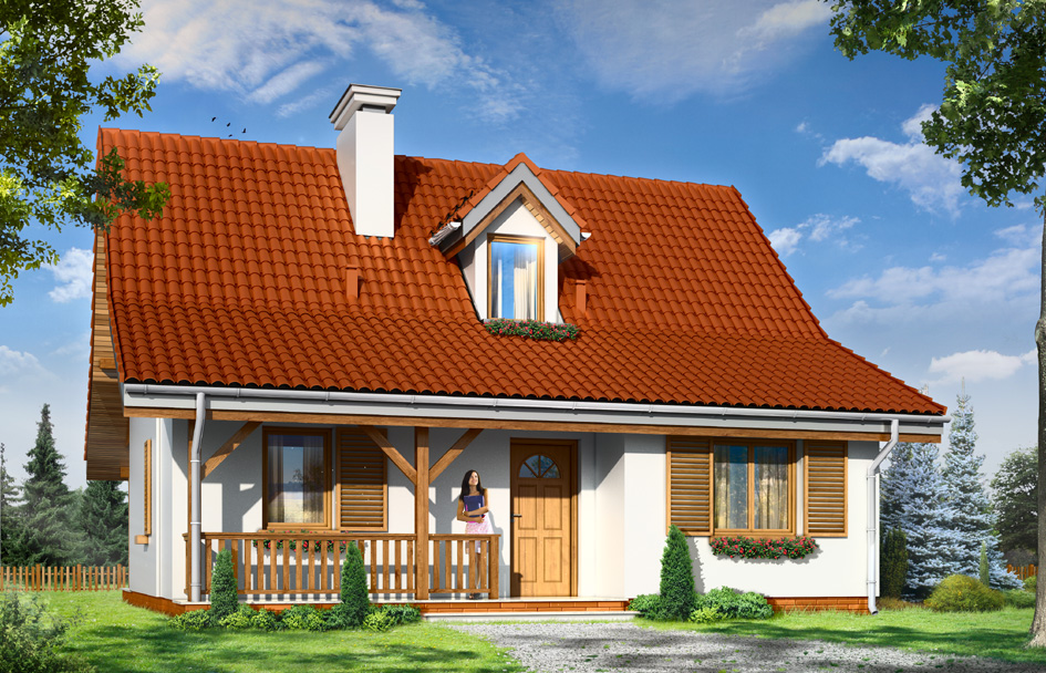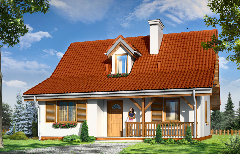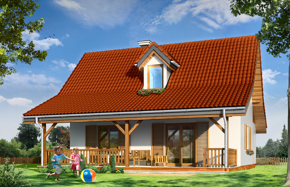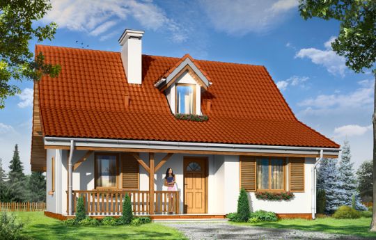 Pine 5 house plan is the next edition of the popular series of Pines houses. House is designed for a family of 3 to 4 people to use as a year-round family house. The building can be used as holiday house. Given the resulting surface this house plan is simple and inexpensive in realization. Solid of the house consists of a substantial part of the attic, covered by a symmetrical gable roof, and two outhouses. Front - comprised room on the ground floor and entrance porch and rear with a large covered terrace. Covered terrace is a great solution magnifying optically a living room. Roof of the building is decorated with two small dormer windows - one on each slope. Inside, on the ground floor is a spacious living room with exposed staircase and a fireplace, kitchen, bathroom, extra room - for example, for a guest bedroom, hall and a boiler room. On the attic is scheduled two bedrooms and a toilet. In house there is designed a central heating form furnace in the boiler room. We have a mirror version of this house.