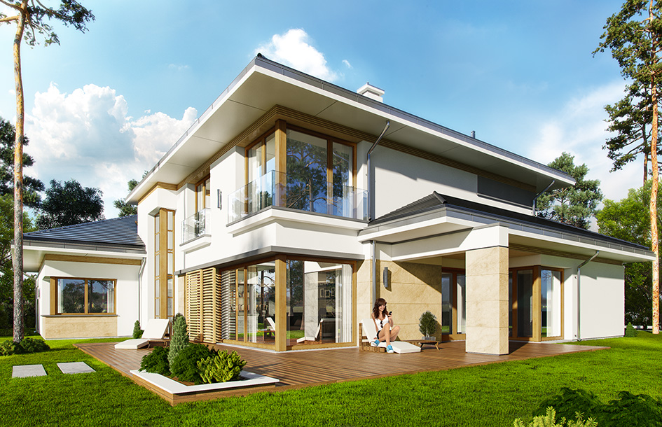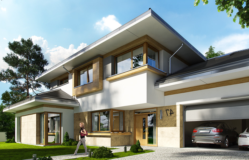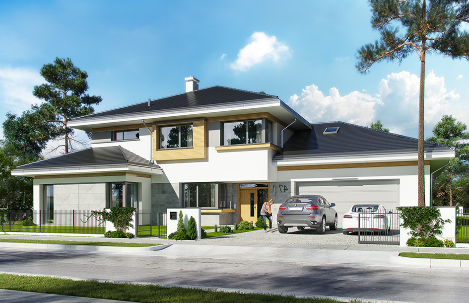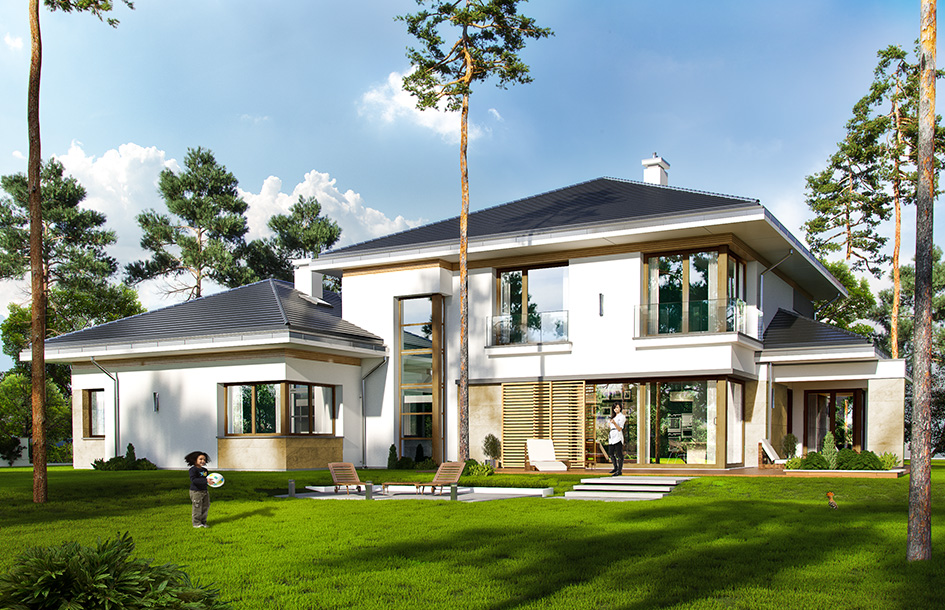 Peaceful corner is a storied luxury urban villa, designed for a family of 4-6 people. House is a very comfortable, modern residence, for demanding investors who appreciate good architecture and luxury in a functional spacious interior. House consists of a basic rectangular solid on a square plan, covered by an roof envelope, and additional two lower blocks, garage and other covering recreation room and terrace. From the outside, house looks dignified, representatively and a little raw from the front to the garden side is very peaceful. Large glassed surfaces of windows decorate the facades and open interior to garden. On the ground floor we designed a beautiful living space, with a living room, a large kitchen with an island, very spectacular stairway opposite the entrance, dining area and an additional recreation room, such second closed living room, where you can install, for example, good cinema, or arrange a fitness room. On the ground floor we have a large garage, an extra room with a private bathroom, and a large utility room. Corner glazing of living room, and a lovely covered porch terrace - from the dining room open house to the garden. On the first floor there are four comfortable bedrooms with wardrobes and two bathrooms. Parents' apartment with its own bathroom and dressing room. On first floor we have also a laundry room, drying room, and an attic accessible from garage and utility room. House is large and has a very rationally arranged space. In this house we obtained the effect of a large luxury space. House is of course energy efficient. Despite its size should not be very expensive under construction and either to maintain later.