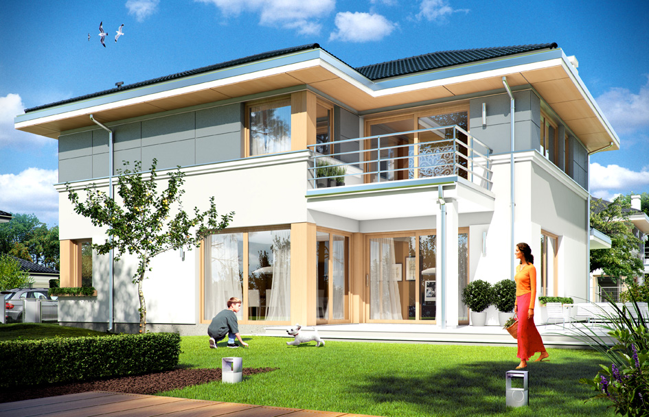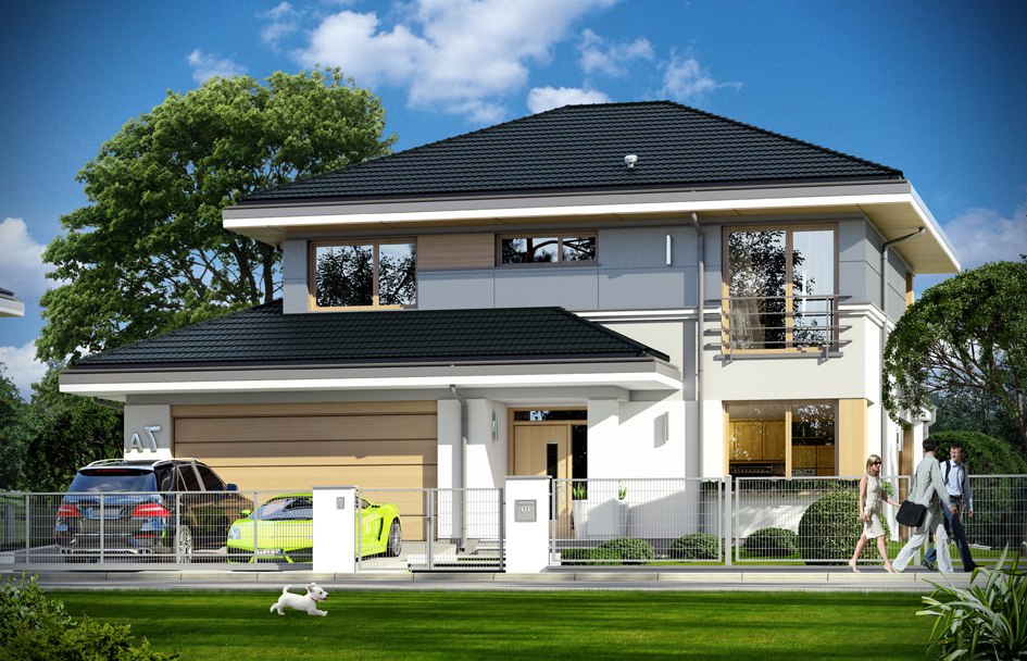 Sydney house plan is storeyed comfortable city villa, with a basement and double garage, suitable for a family of 4-6 people. "Sydney" is a comfortable modern house, with an interesting shape and functional interiors. House is energy efficient, built from good materials and technologies in order to increase the comfort of the residents. Large glazed areas, wall cladding, colors, everything is maintained in a modern style. Additional roofs, balconies, corner windows diversified the body of house. Daily interior was divided into a living area on the ground floor and bedrooms upstairs. In addition there is a basement that besides technical rooms accommodates additional recreational space. On the ground floor was designed open space consisting of living room, dining room, hall and large kitchen. From the living room and dining room we go out by large glazed doors on garden terrace. On the ground floor there are also an extra room, bathroom and garage. On the first floor are four bedrooms, including a parents’ apartment with its own bathroom, dressing room and terrace. "Sydney" is a real house, with a basement and attic. The building, despite its large surface is very sensibly designed, its construction is clear, quiet, simple and has a compact shape. House should be relatively easy and inexpensive to build and cheap in later exploitation.