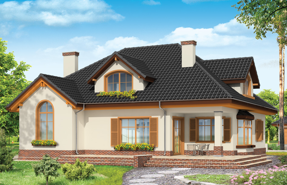 Sympathetic house plan is a story house with an attic. It is a suitable building for a family of 4 to 5 people. Quiet, restrained silhouette, with big hipped roof accommodates very functional, thoughtful interior. Solutions used in the Sympathetic house plan, such as a large entrance porch, nice spacious hall with comfortable stairs, large boiler room, garage or pantry are very useful. Living room connected with hall and dining room create a nice space, open to the garden through large windows. In the attic, each room has its own dressing room, and large bathroom has been linked with a laundry room over the garage. There is also available mirror version of this house plan.