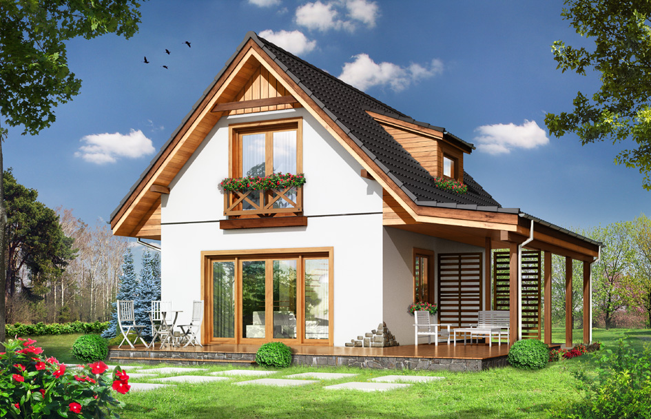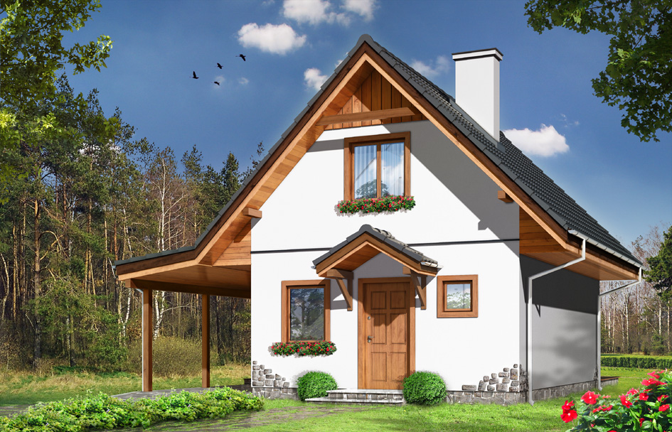 Szarejka house plan is another small detached house. It can serve both as a year-round house or summer house. The house has a very simple structure, built on a rectangular plan. The block is symmetrical covered by gable roof, with built in roof of the carport and terrace arcades. Simple unpretentious form and details of the façade result in a curious appearance of a house. Szarejka has been designed with maximum opening of the interior of the garden - hence the large, partly roofed terrace, to which we reach from the living room through the wide glass doors. Terrace completes the interior - is its extension. You can use is also in bad weather or at too sharp sun - thanks to the large arcaded. Carport - very useful, even if it will not be used for the car, it can provide excellent shelter for wood for the fireplace, and garden equipment. The interior of house is a living room with kitchen annex on the ground floor. In the center of the living room is a fireplace and wooden staircase to the attic. In the attic there are two bedrooms with an extra toilet. Szarejka house was designed in the construction of a wooden frame. The building is heated by a fireplace and electric radiators. Due to the very good thermal insulation of partitions will be economical in later exploitation - it does not require a lot of energy to heat the interior. There is also available mirror version of this house plan.
