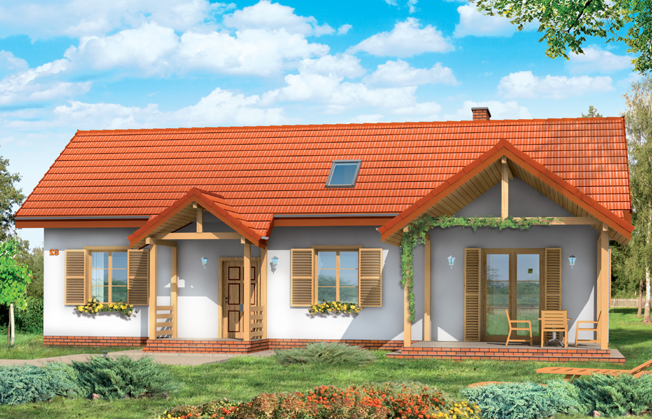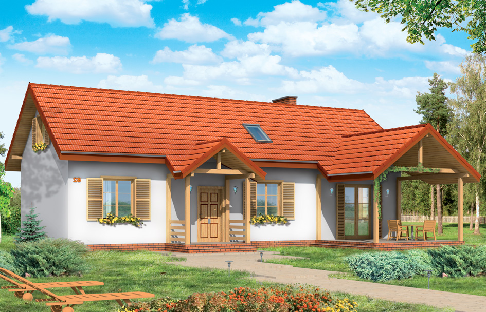Goldfinch house plan is a detached house with a usable attic. Goldfinch house can be use as a family year-round house or as summer house. The rectangular block was covered with a gable roof of the attic. To the main body of the house the garden arcade with access from the living room and arcade - entrance porch was added. The house is ideal for a plot with an entrance from the south or west - where the garden and entrance are on the same side of the house. Goldfinch house has a simple construction - is easy and inexpensive to build. Inside, on the ground floor was planned living room with dining area, open kitchen - connected with utility room, a bathroom with a toilet and two rooms that can be used as bedrooms, or for example as a study rooms. In the attic were designed two bedrooms and a bathroom. Attic can be finished in the second stage of construction. There is also available mirror version of this house plan.
