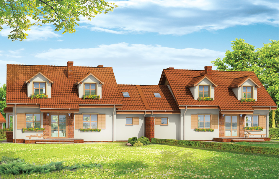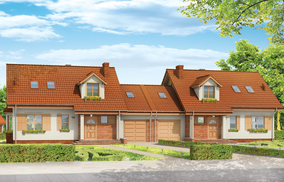 House plan Squall is another project from our series "sea pearls" (see: Breeze and Cliff). This time, a very successful form of the house and the interior we managed to compose as twin building. Two identical half of the building are combined with garages. Squall house plan is a peaceful form - covered by a gable roof, diversified by dormers and extensions of arcades roofs. The simple shape of the building and uncomplicated construction facilitate built and reduce the cost of execution. The interior of house Squall is designed to provide maximum functional. On the ground floor is a living room with a dining area connected to the hall, partially open kitchen, and an extra room - which could serve as a bedroom or e.g. study. In the attic are planned three comfortable bedrooms. Built another garage with utility room and boiler room on the ground floor crowned the attic. It is possible to adapt the utility room, for example an extra room. There is also available mirror version of this house plan