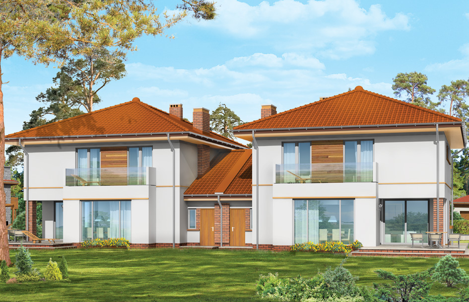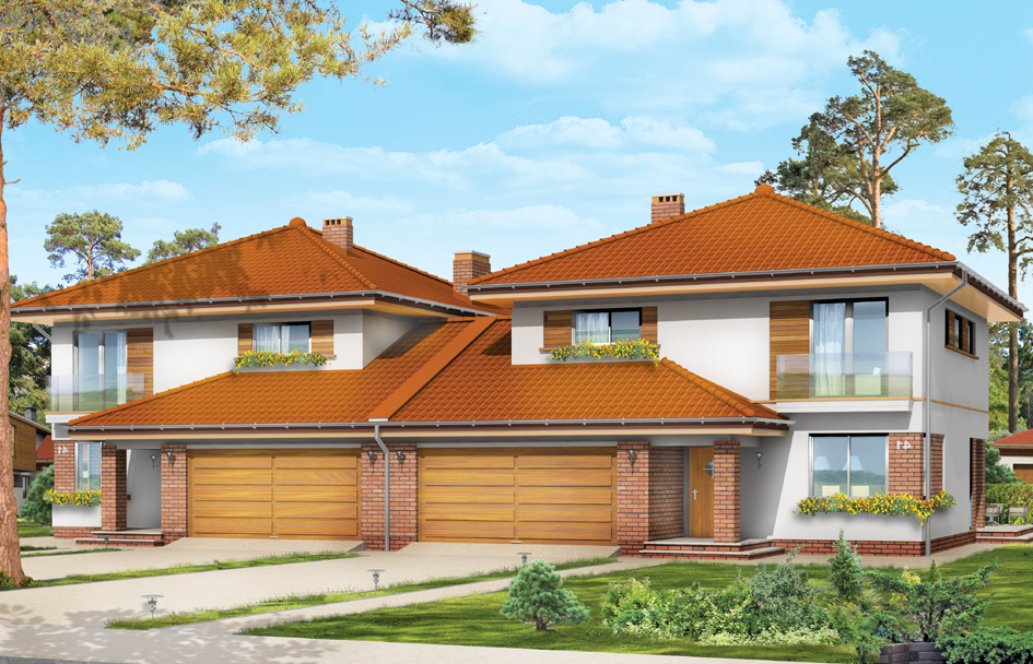 Emerald 2 house plan is a variant version of Emerald house plan. This time is designed as twin. The modern form of the building with attractive details harmonizes with the simple form, built on a square body. Two parts of the twin covered by roofs envelop are combined by garages completed by pitched, lower roof. Thanks to this, house halves allows are visually separated from each other. The principal body of house is enriched with partially protruding garage, entrance arcade and garden, bay window and balcony. Emerald, as a whole, creates a coherent, clear composition. The modern appearance of the building in a harmonious way corresponds to the interior, where on the ground floor is a single, open, daily space: hall, dining room and living room, with large glazed to garden. Dining room is partially combined with the kitchen. On the ground floor there is also a double garage and boiler room. In an apartment on the first floor there are three bedrooms and a bathroom. There is also an extra room that could serve as an study, guest bedroom or dressing room.