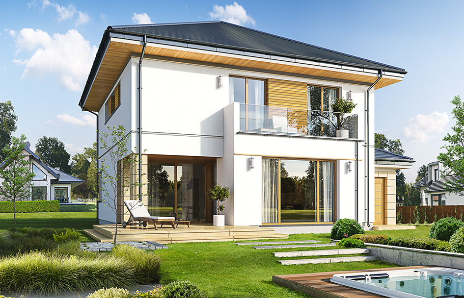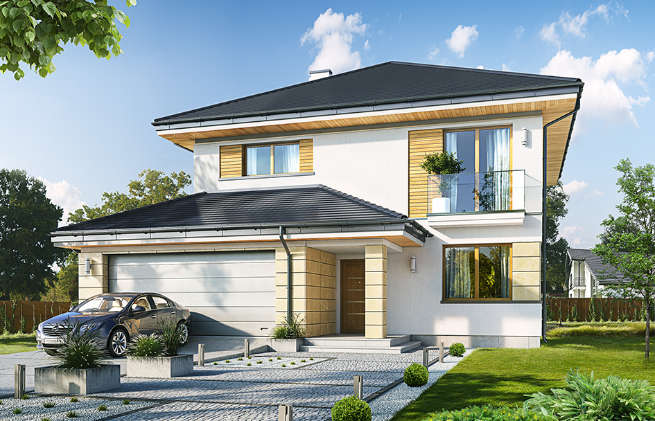 Emerald 6 is a variant version of house with series of Emerald. This is a storeyed, house designed for a family of 4 -6 people, with a compact body, covered with a hipped roof and partially integrated into the body double garage. The house is a proposal for those investors who are planning storey house, at the same time they want to fit in a small usable space, and those whose plot does not allow for the construction of a wide large house, with large building area. Emerald 6 is a modern house, decorated with stone facings (or rustication of plaster), and wooden insertions in elevation. The entrance is emphasized by corner arcade with the column. Front façade is decorated with large windows and a little balcony upstairs bedroom. Garden elevation is primarily a beautiful glazing of living room, arcade over part of the terrace and balcony -terrace with bedroom upstairs. Modern materials and details, as well as the successful proportions of the building body give an attractive whole. The interior of house: on the ground floor we designed daily undivided interior combining hall, living room, dining room and a nice kitchen. Beside is provided garage, boiler room and toilet. On the first floor we have four bedrooms and a bathroom, which at this surface of the house is a good result. Parents' bedroom is the largest and has its own dressing room. The fourth room can be a bedroom, but also for example a home office. The building is modern, energy efficient, has a simple, easy-to-build body. The house will fit well in almost every even a small plot of land, and in any environment. It is modern, but unpretentious.