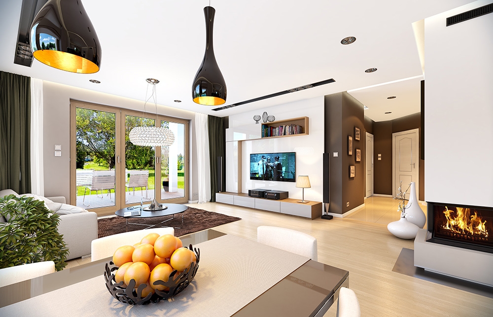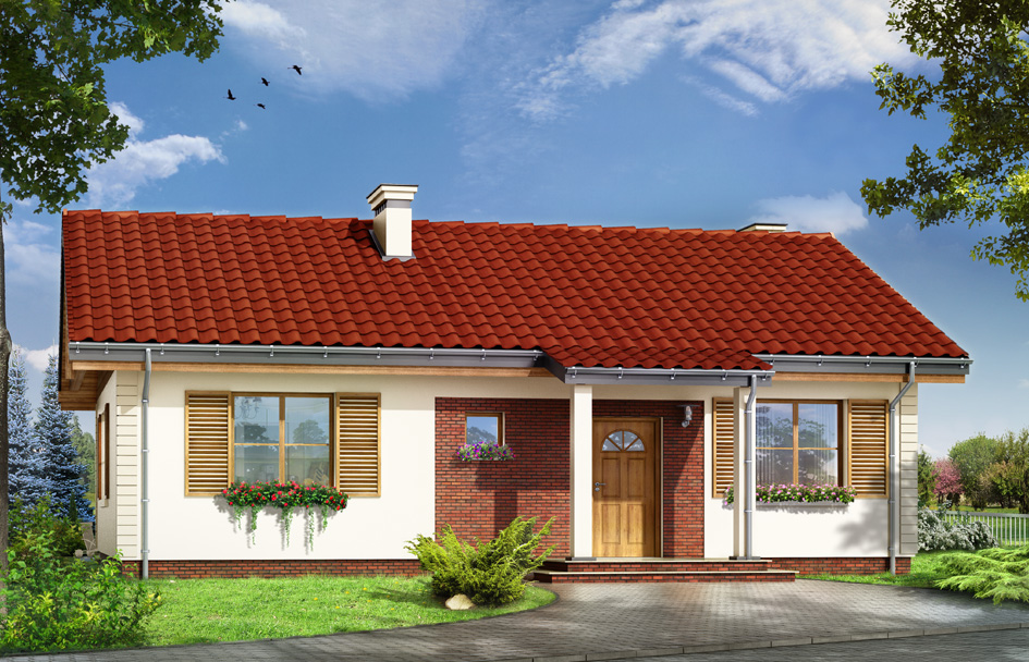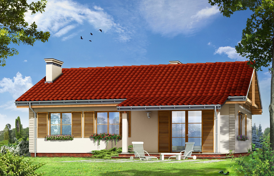 Starling house plan is simple in construction-storey family house, with a quiet, modest architecture. The building is designed for a family of four. Rectangular block of house is covered by a mild gable roof with additional front porch arcades and garden terrace roof, hidden functional, thoughtful interior. Proportional window, façade decorations, extras - like window shutters or columns accented the entrance and give the façades attractive appearance. Inside the house is divided into daily part: large living room with fireplace, partially open and easy to arrange kitchen, and comfortable hall, and night part: bedrooms, which are a little separated from the living room. Salon have wide glass door, which is very nicely combine with a garden terrace. Terrace roofing creates a natural extension of the living room. Each of the three bedrooms have built in wardrobes. There is also bathroom and additional toilet with shower. Next to the large atrium we designed boiler room adapted for heating of solid fuel. Starling house is designed in a timeless aesthetic, using traditional, durable materials. It's just a normal house.There is also available mirror version of this house plan.