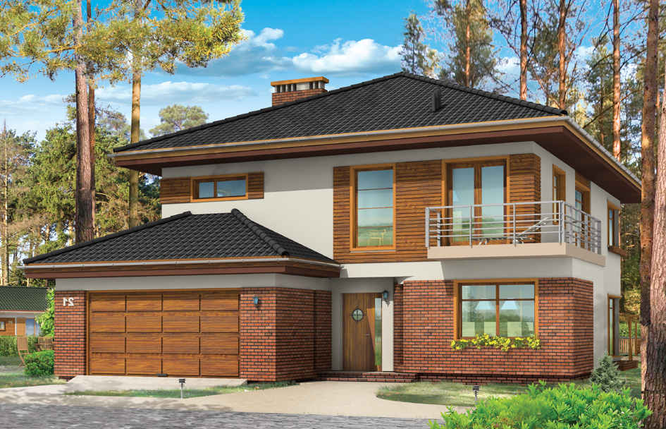 Topaz 3 house plan is a variant version of the popular house plan Topaz. This time with enlarged garage to the surface of 40.6 m2 and outdoor fireplace on the garden terrace. In Topaz 3 kitchen has been also enlarged. House combines tradition with modernity. Modern style and materials have been applied in a calm, understated manner. The interior is designed with divided into single, open space: living room, dining room and lounge are combined (with a partial opening to the kitchen and the possible opening on the study room), and the floor with the bedrooms. House has a lot of glass opening the interior to the surrounding garden. Simple in design shape of the building, despite the considerable area of the house reduces the cost of construction. There is also available mirror version of this house plan.
