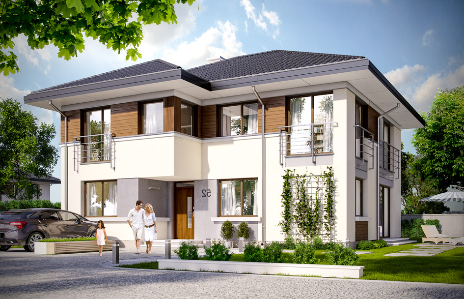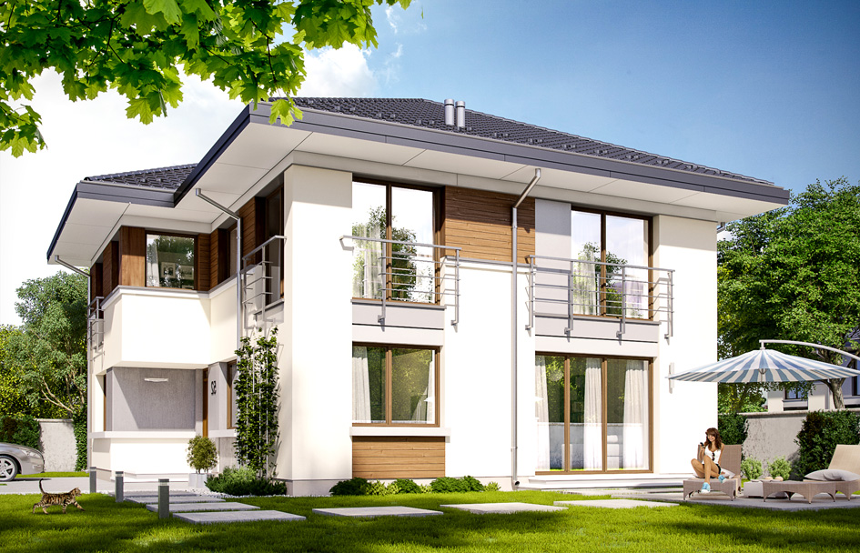 Titan 2 house plan is a new version of the popular project Titan. Titan 2 is available in three variants: Titan 2,Titan 2 variant B - house with a smaller number of windows on the ground floor and on the first floor (with fewer number of glazing), and Titan 2 variant C – house plan with a roof with a greater angle (30 degrees). Titan 2 is storey building, designed for a family of 5-7 people. The house is suitable for investors who want to squeeze up a large number of rooms with a small space. In order to maximize the use of interior we decide to resigned from garage. House is as simple and practical. On the ground floor we have a living room, kitchen with dining area, extra size room (e.g. for seniors), and a bathroom and utility room. On the first floor we have four full-size rooms, a large wardrobe and a very nice bathroom. And everything on 170 meters of surface. Body of the house is simple, but composed into a nice modern architecture. Elevations were divided into horizontal stripes, visually lowering body. The house is suitable for a plot with a garden on the side - where we have a disadvantageous location of the of entry into the land in relation to the sun. The house is very well insulated and energy efficient. Thanks to the simple body it will be easy and inexpensive to build.