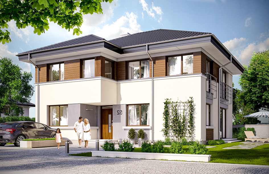 Titan 2 B house plan is a new version of the project Titan 2 – with a fewer number of balcony windows on the ground and first floor. Titan 2B storey building, designed for a family of 5-7 people. The house is suitable for investors who want to squeeze up a large number of rooms with a small space. In order to maximize the use of interior we decide to resigned from garage. House is as simple and practical. On the ground floor we have a living room, kitchen with dining area, extra size room (e.g. for seniors), and a bathroom and utility room. On the first floor we have four full-size rooms, a large wardrobe and a very nice bathroom. And everything on 170 meters of surface. Body of the house is simple, but composed into a nice modern architecture. Elevations were divided into horizontal stripes, visually lowering body. The house is suitable for a plot with a garden on the side - where we have a disadvantageous location of the of entry into the land in relation to the sun. The house is very well insulated and energy efficient. Thanks to the simple body it will be easy and inexpensive to build.