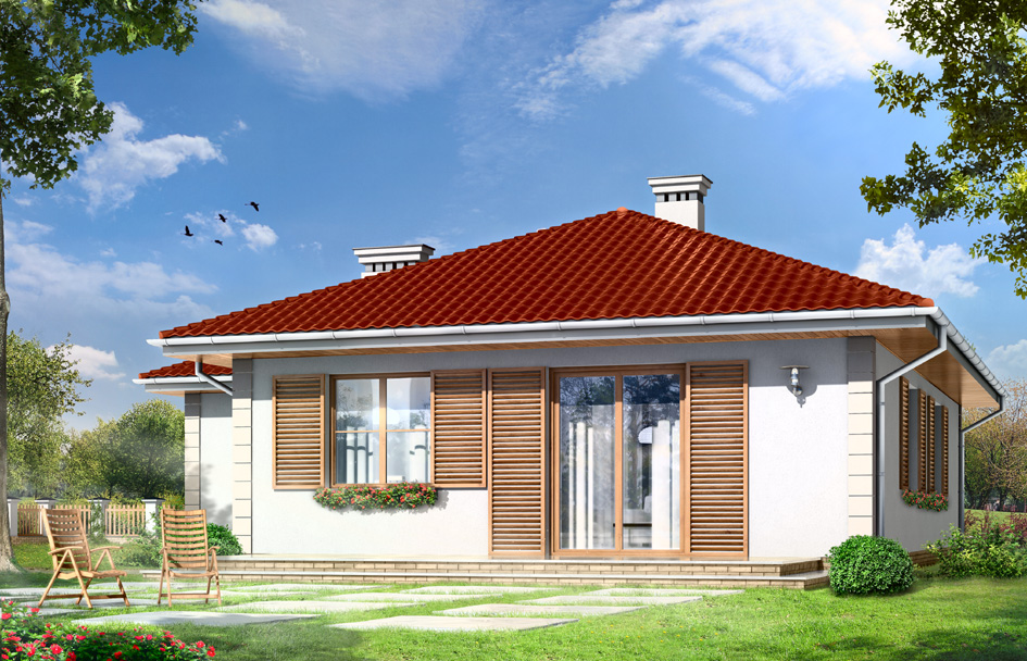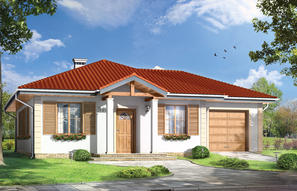 Tyke 2 house plan is suitable house for a family of four people. House is built on a rectangular plan and covered by a hipped roof, it has built another garage. It is a house suitable for on a narrow plot. Thanks to entrance from the narrow end, house together with garage fit perfectly to 19 meters plot. Inside house on a small area managed to design a comfortable, four-room apartment with a technical background, consisting of: a spacious living room with kitchen, three bedrooms, bathroom, toilet and boiler room. In the living room were designed central fireplace and wide glass door to the garden terrace. From the kitchen window you can also enjoy the garden and terrace. From the outside, house refers to the architecture of mansions, in the modern sense. Entrance porch on small columns, window shutters, or rusticated corners - all these elements fit perfectly into the gentle hipped roof. There is also available mirror version of this house plan.
