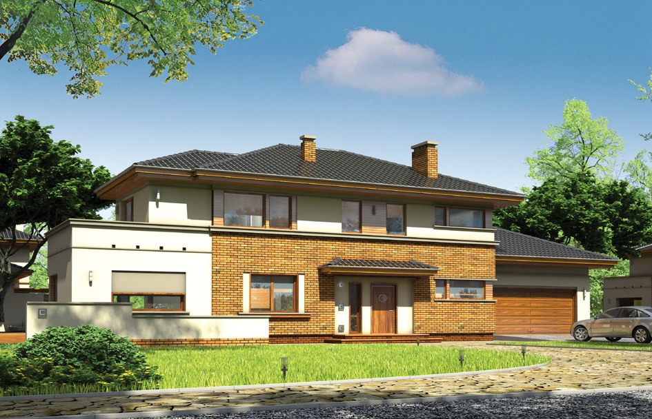 Verona is a house suitable for a family of four-five people. Storey house is covered by a hipped roof. The building has been designed so that it can fit on a shallow plot, with little depth from the front fence along the road to the back of the plot. This house plan is especially dedicated to the plots, which due to its depth have garden on the side of the house. Modern architectural form of Verona house, refers to F.L.Wright projects. Storey front elevation of the house was divided by horizontal stripes with the lower part with the clinker. So the building appears to be lower and more rooted in the surroundings. Additional solids of garage and kitchen with a flat roof diversified composition. From the garden corner patio with a partly covered terrace, which overlooks to the wide transition of the living room and kitchen was designed. Interior of the Verona house is divided into single daily space on the ground floor, with a spectacular staircase, fireplace-TV wall in the living room, and night part upstairs with a separate parents’ apartment. In the attic above the garage is a large attic for any use. On the ground floor next to the living room are designed extra room - study or a guest bedroom. There is also available mirror version of this house plan.