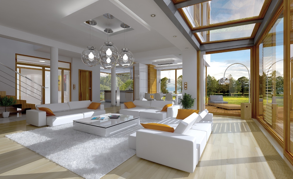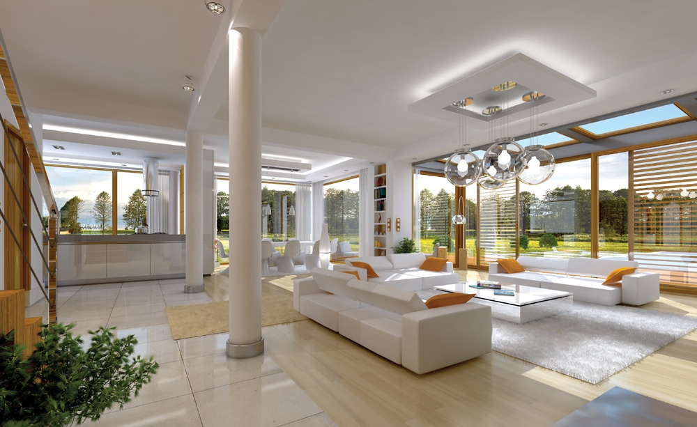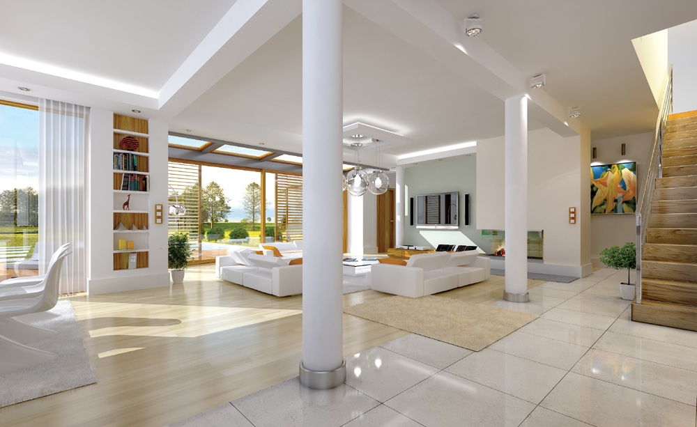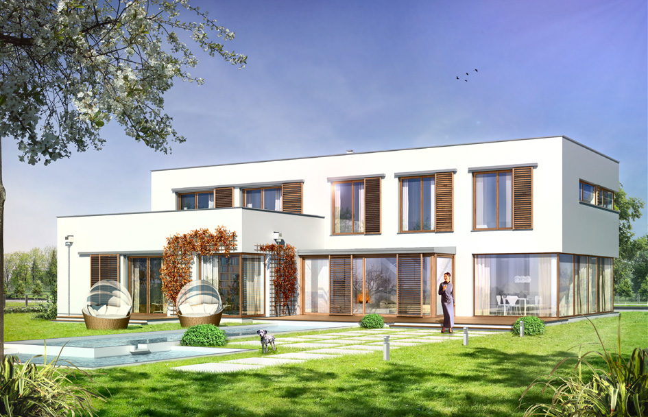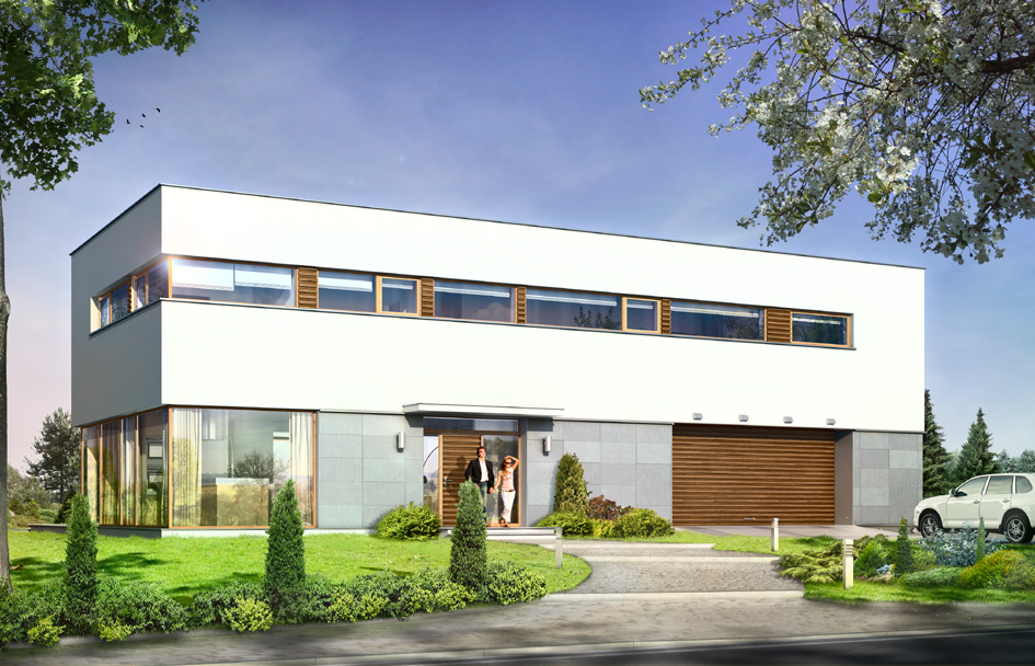 Vertigo house plan is designed for large, family of even seven people, designed in the convention of modern urban villa. Building was designed as storey, with a flat roof, consisting of two juxtaposed and intermingled rectangular solids. Exterior architecture of Vertigo has two faces. From the front elevation the building gives the impression of massive closed before the eye of strangers, with a small amount of glazing, with only accented a part of entrance vestibule. From the garden elevation has a different face - open to the garden, with lots of glass surfaces, with a conservatory between the interior of the living room and terrace. From the garden massive storey block was balanced by ground floor part with large glazed. Sliding shutters and windows refer to Mediterranean villa - despite ultra-modern lines of the building. The whole point of the project was subjugation raw geometric modernity and softening its by natural materials. Interior of the house is divided into four parts. On the ground floor: daily - living room, parents' apartment, utility part - with a garage and boiler room, and some of the bedrooms on the first floor. Large undivided daily interior attracts the attention, with a living room, dining room, hall - with representative staircase and a kitchen. All rooms are fully open to the garden - with glass walls from floor up to ceiling. Decorations, as a conservatory in the living room, a large corner fireplace, beautiful kitchen with central island, makes that the house is special and unique. A large number of rooms – e.g. bedrooms, will allow to live here even very large family.There is also available mirror version of this house plan.