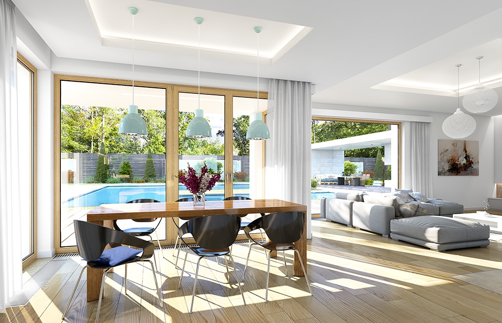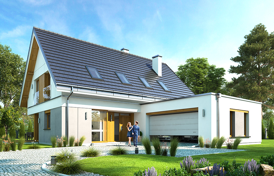 Viking house plan is the basic version of the house plan with series Viking houses. This is a storey house with usable attic for a family of 4-6 people. The house has a simple bod and is energy-efficient, it is built on a rectangular plan, covered with a symmetrical gable roof, with build another garage. Thanks to proper layout of interior, window and door openings, house is suitable for both the plot of the road opposite the entrance (parallel to ridge) and for the plot of the entrance from the south (the entrance is located opposite the garage gates). Modern architecture and functional interior will suit to people who appreciate sense and maximum effect in architecture by using minimal resources. Front of Viking house plan is accented by a large glazing of the kitchen and arcades of the entrance doors. The front and garage wall form the entrance plaza. Thanks to this solution before the house will be plenty of space for a comfortable driveway, parking, and a representative greenery. Beck of the house is dominated by large glazing of living room and dining room, opening the interior of the ground floor to the garden, and a comfortable arcade which partially roofed the terrace. The interior is divided into living and utility part of house on the ground floor and bedrooms in the attic. On the ground floor undivided interior of the living room, dining room and lobby, with a partially open to the dining area, kitchen with pantry were designed. Next to the living room there is an additional room: office or guest bedroom and bathroom, next to the stairs we go to the utility part of house, with utility room, boiler room and a garage for two cars. In the attic, were designed two large children’s bedrooms with wardrobes built, bathroom, laundry room, and a separate parents apartment with two dressing rooms and a separate large bathroom. House is very convenient and comfortable. At the same time its simple shape and design will allow for efficient and inexpensive build and energy efficient solutions and the compactness of the building - small housing costs. House plan is available in mirror version and in some other versions e.g. with single garage and narrowed main body (house plan Viking 2), without the garage (house plan Viking 3), with a roof above the garage (house plan Viking 4), and the largest one (house plan Viking 5)