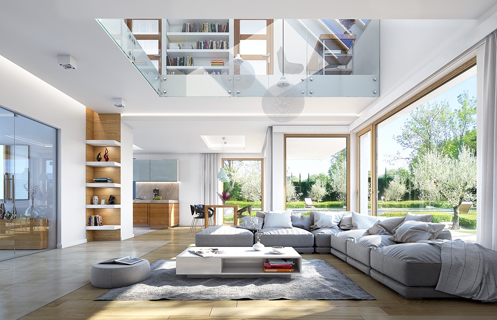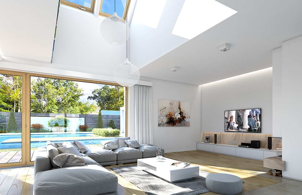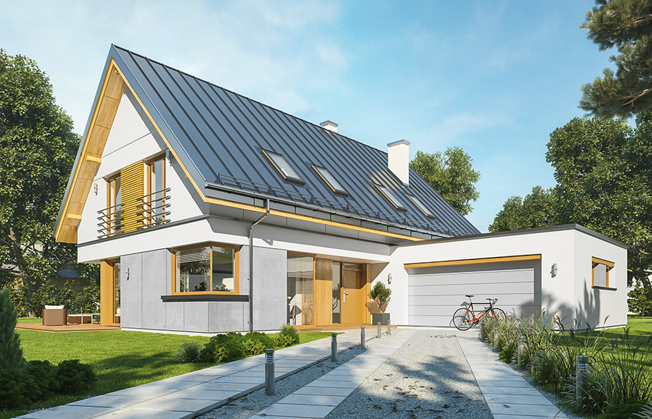 Viking 5 house plan is an enlarged version of the house plan Viking, with an elongated main block, with a larger living room and emptiness and with mezzanine above the living area. It is very comfortable proposition for a family of 4-6 people family - a modern, functional, with a very attractive silhouette and interior. Viking 5 has been broadened in relation to the basic design, which looks more representative and impressive. This comfortable modern villa, with interesting materials and details, and beautiful wide glazing opening inside the garden. Materials used: covering of the roof with metal sheet seam, cladding of walls with wood or fiber-cement boards, and the division of the elevation into horizontal stripes, give an attractive appearance of the building. Interior: we enter the house by a glazed open atrium directly into the living room, connecting the hall, lounge and dining area. Thanks to the wide windows we have a view on the garden and terrace. In addition, the attractiveness of the interior adds emptiness above the living room with a mezzanine in the attic. Next to the dining room we have a pretty easy to arrange kitchen with a pantry, and on the other side of the ground floor an extra room, bathroom and utility room with garage. In the attic there are three bedrooms: two for children - of equal size, with built-in wardrobes and a bathroom, and parents' bedroom with two walk-in closets and a private bathroom. The house does not belong to the smallest, but it is also the several hundred meters residence. It is designed for investors who want to live with maximum comfort and modern, but do not intend to become the slaves of their future house. House plan is available in mirror version, in basic versions (house plan Viking), version with single garage and narrowed main body (house plan Viking 2), without the garage (house plan Viking 3), with a roof above the garage (house plan Viking 4), and the largest one (house plan Viking 5)