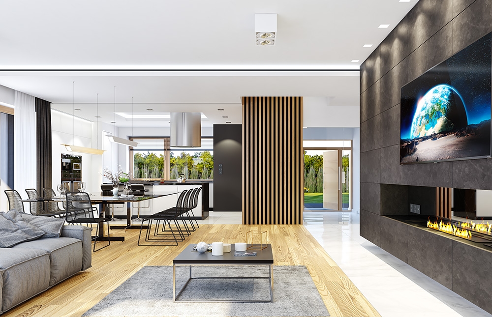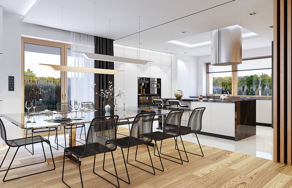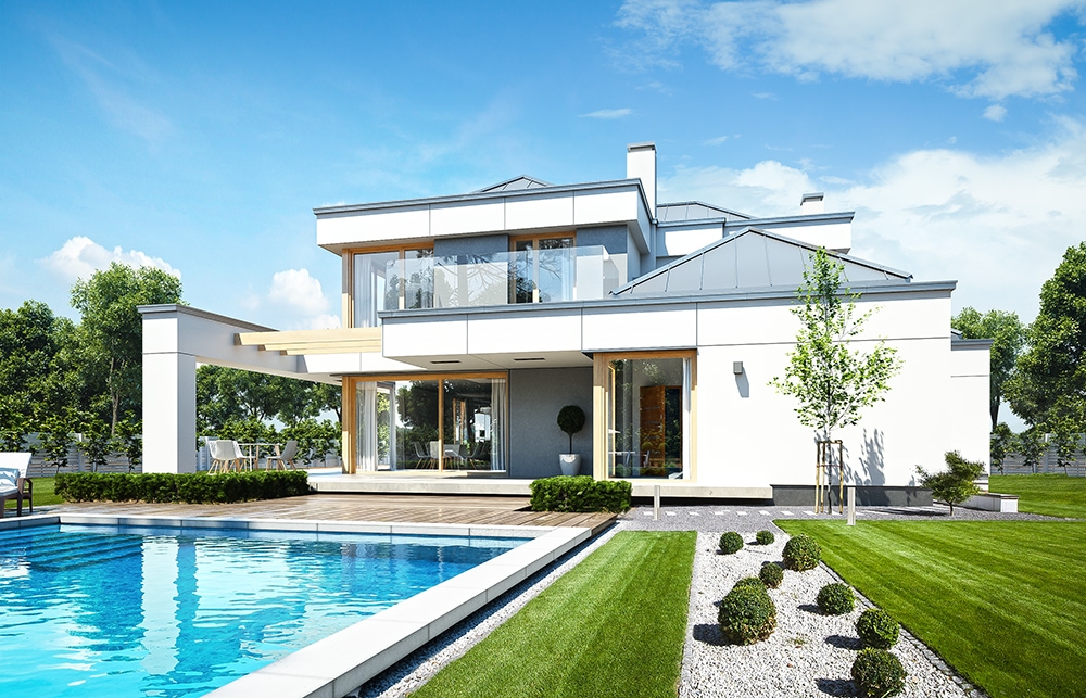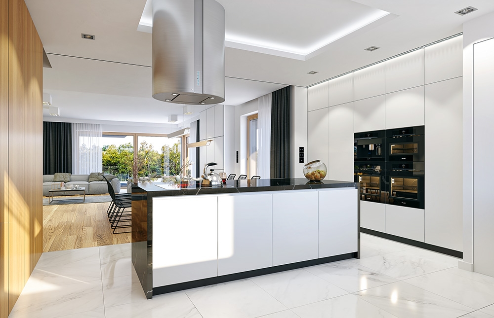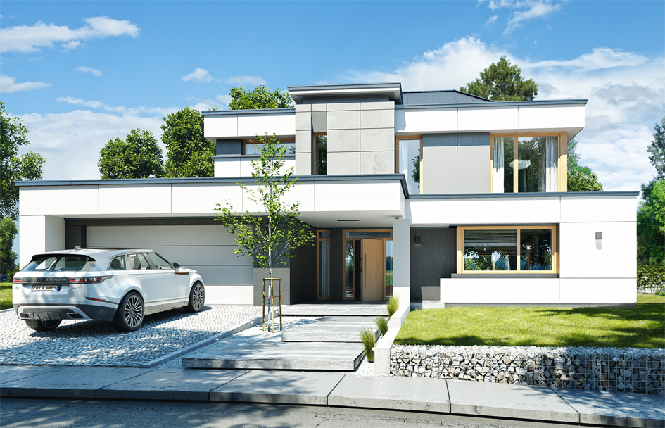 Willa Florida 3 house plan is our next proposal from the Willa Florida series. The house is aesthetically and architecturally related to the "Florid" series, while the functional layout and appearance are completely different. The building is two-storey, with a two-story core encased with one-storey parts from the front and back. Thanks to this the body is very varied and looks light. The house combines the advantages of a two-story and one-story building, which is close to the garden and on a human scale. Elevations were divided into horizontal stripes: dark stripes in storey and window thickness, and contrasting white stripes in the thickness of the ceilings. The bright parts of the façade protrude forward, while the darker parts of the walls hide, making the body more interesting and more sculpted. The entrance to the house is accented by a beautiful arcade, and a massive wall finished with stone or architectural concrete. The corner window of the kitchen and floor glazing add lightness and transparency to the front of the house. In a real way, the house opens its interior from the garden. Corner glazing of the living room and bedroom at the top connect the interior with the garden. At the same time, the arcade and pergola, based on a protruding pole and a podium, create an internal terrace space - a peculiar patio that protects the privacy of residents. The modern silhouette of the house will certainly distinguish this beautiful residence from the surrounding boring buildings. The ground floor of the house is designed on a plan similar to a square. We enter the building through a spacious vestibule with a cloakroom, combined with a garage on one side and a pantry and kitchen on the other. In this way, both entering the house on foot and arriving by car is convenient and leads us to the same place. From the vestibule, we get to the lobby, with representative stairs on the right and open large day space on the left. The living room, dining room and kitchen with the island combine in a nearly 90-meter area. The living room opens onto an L-shaped corner terrace. On the ground floor, we still have an additional space - two rooms for any purpose - a rarity in multi-storey houses. These can be bedrooms, or rooms for work or recreation. Or it may be a separate apartment for a senior citizen or a housekeeper. Space for any arrangement. From the house and from the garage, we also get to a large utility room - boiler room. The first floor consists of three bedrooms: parents' apartment with their own dressing rooms and bathroom, and children's bedrooms with built-in wardrobes and a bathroom accessible from the hall. We also have a laundry room on the first floor. The floor of the first floor is connected to the ground floor with a hole in the stairs, and a small hole in the ceiling. The house is modern, luxurious and comfortable. Of course, Villa Florida 3 is an energy-efficient building - thanks to the materials and installations used