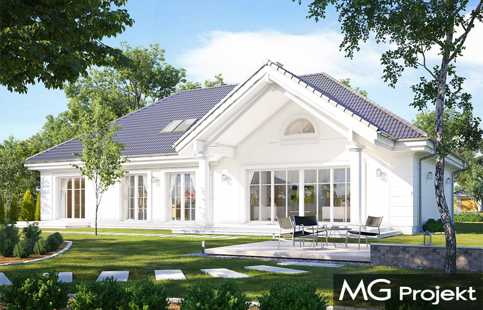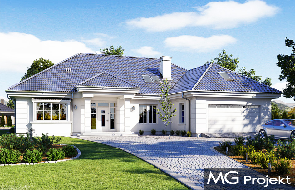 The house plan Villa Park 5 is another project from the popular series of houses "Villa Park - Park Residence". A one-storey house, with an attic, built on a rectangular block covered with a hipped roof, with a built-in garage part. The house was designed in reference to the traditional residential style, with details emphasizing the representative character, giving comfort and the impression of luxury. The architecture of the house is attractive, but also toned down and discreet. The house refers to tradition, but in a more modern contemporary perspective. The front of the house is decorated with a beautiful entrance portico, with side glazing of the entrance door and an arched window. The representative entrance door invites us to the interior of the villa. From the garden side, large glazing of individual rooms - including the largest wide glazed living room, open to the terrace and garden. The interior of the ground floor is functionally divided into three parts: daily part: living room with dining room, kitchen and hall, next to the utility and garage part: garage and boiler room available from the vestibule, and the night part consisting of three bedrooms on the ground floor, and attic with up to three additional rooms upstairs. Attic can be freely used or adapt. On the ground floor, we have two bathrooms and an additional toilet, and a laundry room next to the bedrooms. The parents' apartment has its own bathroom and a dressing room. The house is functionally designed, practically, it has all the rooms needed for the functioning of the whole family. Thanks to the attic, we have space for additional use. The building has a simple construction, it is not difficult to build. Thanks to the use of energy-saving materials and installations, the building will be inexpensive to operate.