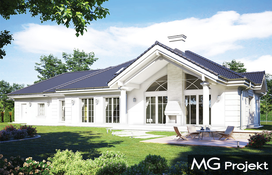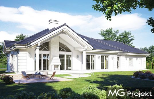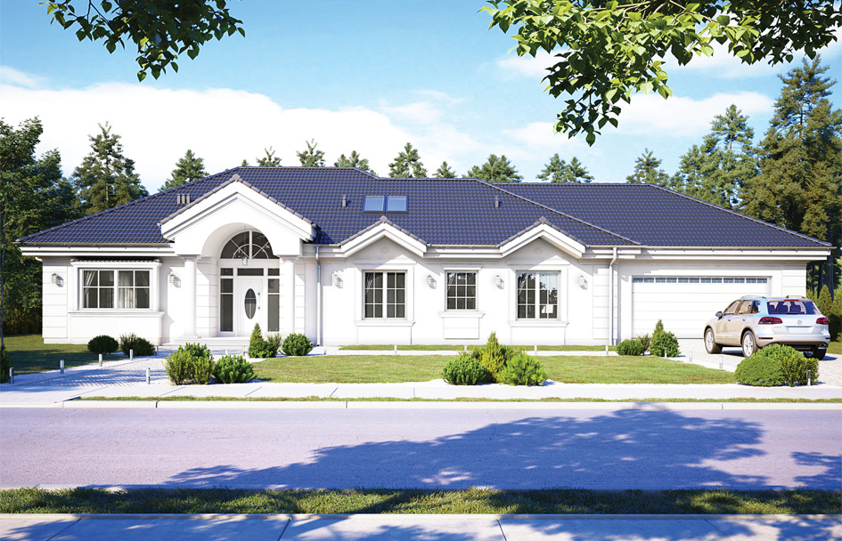 House plan Villa Pak C is a single family house plan from the popular series of Villa Park. The house was designed based on the investors' suggestions who liked the design of the Park Villa, but would like to have a garage on the side, not protruding from the front wall - either for aesthetic reasons, or because of a shallow plot. The building's body is currently oblong, it consists of a rectangular main residential part and an additional garage - economic one. Architecturally, the house refers to the Polish manor house and suburban American villas. The classic form and details harmonize here with modern materials, technologies and interior functionality. We enter the house through a beautiful arcade with columns and a solid door. The vestibule with a raised arched ceiling is the first attraction. Then we go to the open day space, with the emptiness above the living room and large raised glazed windows opening the living room to the terrace and garden. On the ground floor in the living area we have a comfortable kitchen with an island and pantry, a living room with a dining and seating area, and a hall with representative stairs upstairs. Next to it there are bedrooms that are accessible from the corridor: parents' apartment with its own bathroom and dressing room, as well as two children's bedrooms, a bathroom and a laundry room. The economic part of the house is separated from the rest of the interior, which is especially appreciated by clients who build outside the city. Above the ground floor is an attic, which can easily be converted into a usable attic. From the attic through the entresol we have a view of the living room below. The house is very comfortable. It is an ideal proposition for people who dream about comfortable living on the ground floor, on one floor, close to the garden. The building was designed as energy-saving, using modern materials and installations. The house does not have a difficult structure - it should be quite simple to build.