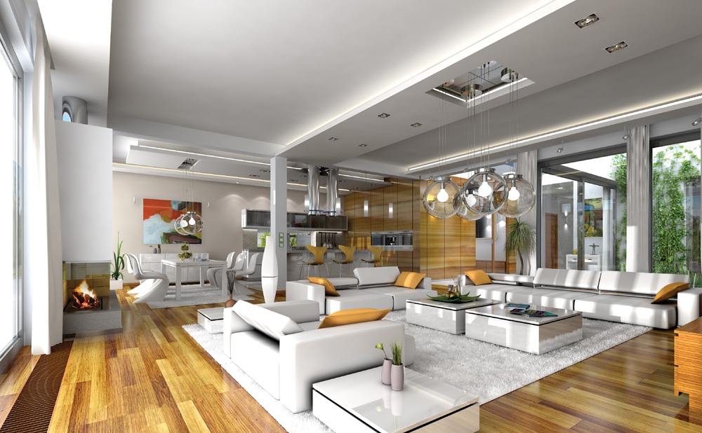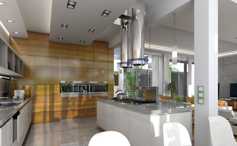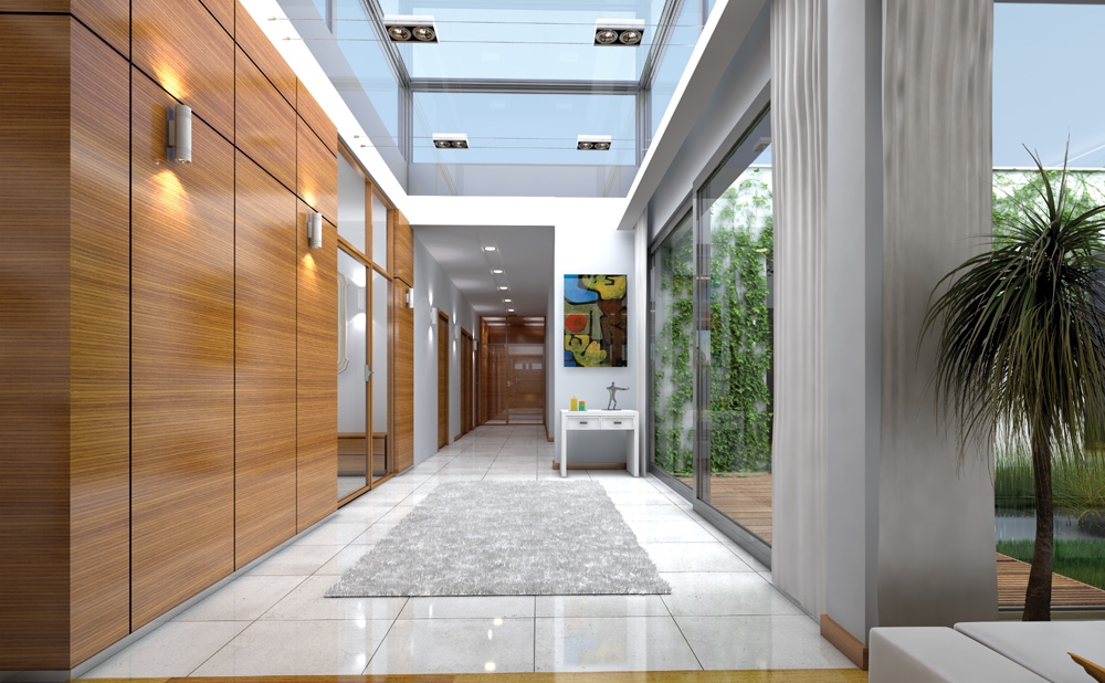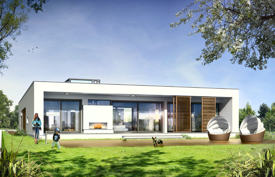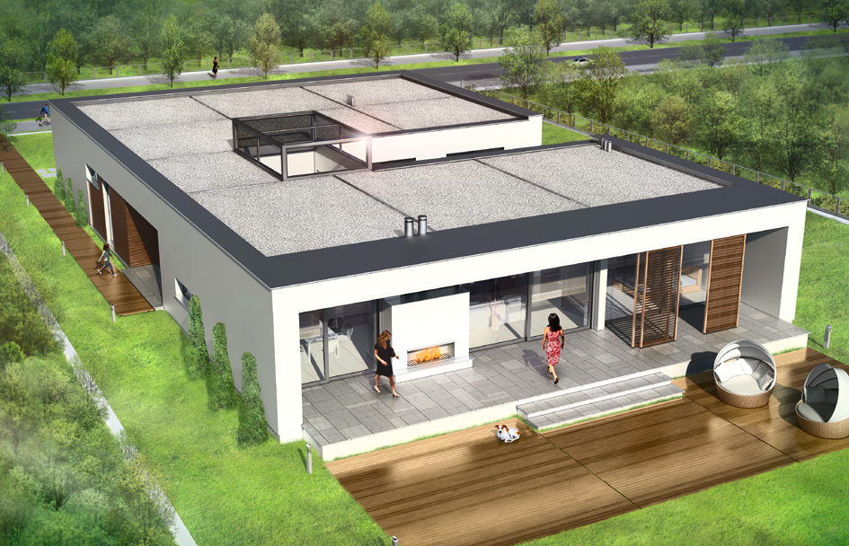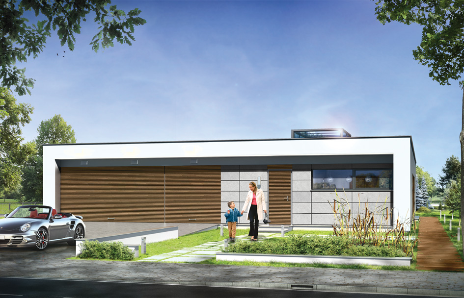 Villa Atrium - is detached house, designed as a single-storey, covered by flat-roof "box" with an open entrance elevation, glassed garden elevation and inner atrium. Atrium in the middle of the body allows you light the internal rooms and create a private, intimate garden - completely isolated from the eyes of neighbors. Space of house is divided functionally into parts. In the front part were designed technical rooms - with a large garage and boiler room, there is also children's bedrooms and a guest suite and study room - office. In the garden part were designed living room, with kitchen, dining area and lobby, and parents’ apartment, with a bedroom, bathroom and dressing room. Large amount of glazing - from the living room and bedroom - gives you the opportunity for contact with the surrounding nature. The house has two separate entrances: daily - from the front elevation, between the garage and office, and the second - representative, leading along the side elevation to enter doors through the glass atrium then to elevated central vestibule, with a skylight in the roof and beautiful views of the interior atrium. Uses rarely seen details, materials and solutions - as completely glazed, hidden in the arcade facade garden, with massive two-sided fireplace, and beautiful kitchen island visible from the living room. These elements provide uniqueness and style of your house. Both the external appearance of the house and its interiors create a unique and original effect. There is also available mirror version of this house plan.