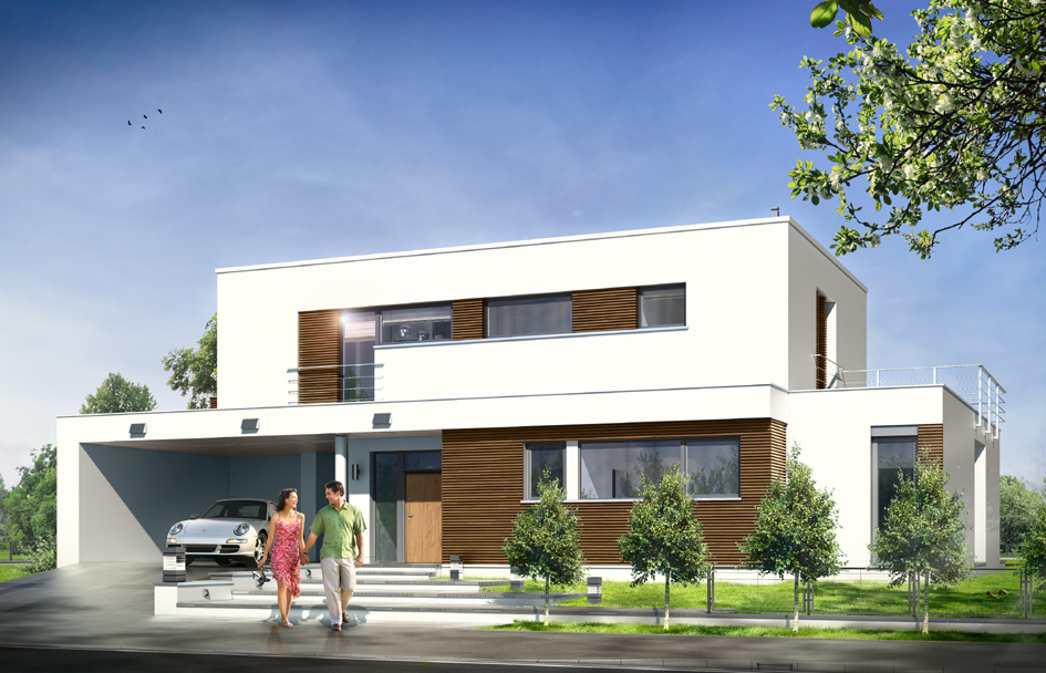 Villa l'Azur is an elegant, one-storey detached house with a flat roof, designed for family of 4-5 people. Building consists of a main one-storey body, surrounded by a storey outhouse and terraces. Architecturally, Villa l 'Azur refers to the modernist, twentieth-century villas with flat roofs - in contemporary terms, with using modern materials and solutions. House is at the same time interesting and intriguing at the same time toned and restrained in expression. Penetrating mutually cubes blocks, massive roofs, large glass - all this creates a unique whole. Contrasting surfaces of white walls, in combination with wooden cladding, windows and chiaroscuro create a very "sculptural" form of the building. House is designed in two variants - with carport from the front or with garage. The interior of the villa is classically divided in daily part on the ground floor and bedrooms upstairs. From large glazed atrium we go to the central hall - dining room, combined with an open kitchen with an island and beautiful living room with a tripartite set fireplace. Living room has in the most part increased ceiling, beautiful glass doors to the garden. The kitchen is connected to the utility rooms- with a boiler room and pantry. On the ground floor for was designed extra room - for example office, bathroom and carport or garage. On the first floor there are three bedrooms, including parents’ apartment with a separate dressing room and bathroom. From the bedroom you can go out on the beautiful terrace on the top floor. There is also available mirror version of this house plan.