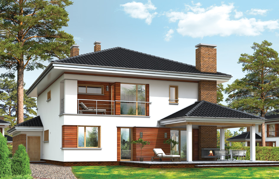 Villa on Borowa is storey family house for a family of four-six people, covered with a hipped roof. House is a suburban villa of modern but quiet architecture. Compact shape of the building with built another garage and large roofed arcade on the back of the house is decorated with interesting clinker and wooden cladding elevation, loggias and entrance arcades. Massive ornate chimney of internal and external fireplace, and corner windows are additional decorations of solid. All elements form a cohesive, peaceful in composition whole. On the ground floor is large living room with dining area and lobby, with a partially open kitchen and an extra room - study room or a guest bedroom. On the first floor we have bedrooms, with a separate parents’ apartment with bathroom, dressing room and balcony overlooking the garden. On the ground floor for by a vide glazing from living room exit to the large arcade and garden terrace was planned. There is also available mirror version of this house plan.