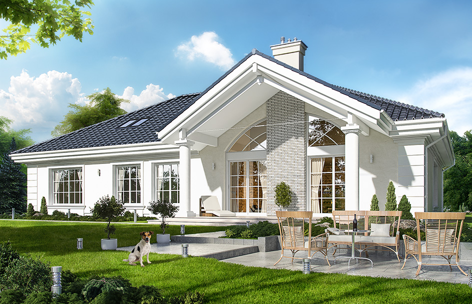 Villa park 2 house plan is the next version of the popular house plan Villa park. This time the house has a slightly narrower block. It is a comfortable ground floor villa, architecturally, referring to American residence. The details used in combine modern materials with a classical form. This house has never gets old and gets bored - will always be fashionable. The building was designed as a ground-floor building, which is the most convenient for life. All rooms are on one level. All the rooms - both living and bedrooms have direct contact with the surrounding garden. Front of the building highlights the representative entrance portico, with large glass doors leading to a comfortable atrium. Protruding before front elevation garage allows for slight withdrawal of the front wall. It creates the same proper distance from the road. In the garden elevation is designed large covered terrace - place for family for gatherings and relaxation. The house is covered with a proportional roof. The interior of the house was divided into day and night part. Living room with emptiness connects to the dining room, hall, kitchen and create nearly hundred-meter interior. This space is pure luxury. In the part there are three bedrooms (including master bedroom with dressing room), two bathrooms, and useful laundry. From the entrance hall, we pass through the cloakroom of utility room and a large garage with utility space and boiler room. Above the ground floor we have a large attic, which can be left as a home magazine, or adapt on a usable attic. If the investor has the hunger of space and plans to build a house, where finally will feel freely it is a project for him. The building has good insulation and modern energy-saving materials. House will not be very expensive to maintain. We have a mirror version of this house plan and other versions: basic (Villa Park), and the largest one (Villa Park 3).