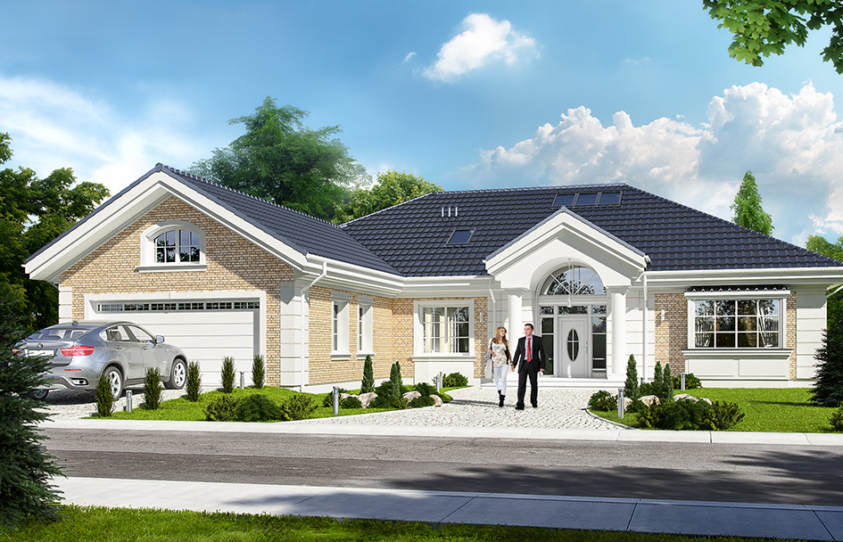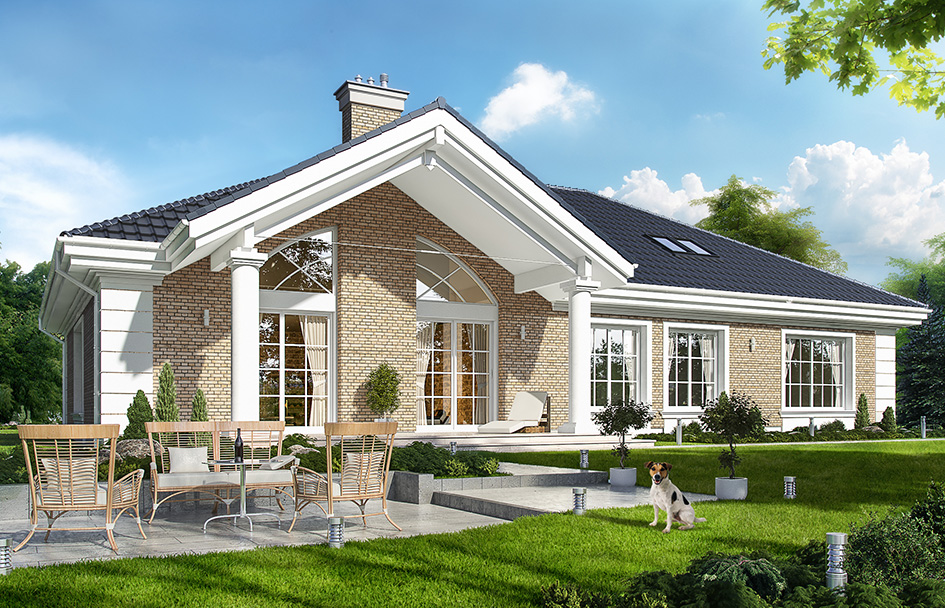 Villa park 3 house plan is the next version of the popular house plan Villa park. This time the house has a compact block on the narrow plot. It is a comfortable ground floor villa, architecturally, referring to American residence. The details used in combine modern materials with a classical form. This house has never gets old and gets bored - will always be fashionable. The building was designed as a ground-floor building, which is the most convenient for life. All rooms are on one level. All the rooms - both living and bedrooms have direct contact with the surrounding garden. Front of the building highlights the representative entrance portico, with large glass doors leading to a comfortable atrium. Protruding before front elevation garage allows for slight withdrawal of the front wall. It creates the same proper distance from the road. In the garden elevation is designed large covered terrace - place for family for gatherings and relaxation. The house is covered with a proportional roof. Elevations of the house was decorated with clinker tiles, which give the impression of solidity, luxury and certainly distinguish a villa among the surrounding buildings of plastered. The interior of the house was divided into day and night part. The interior of the house was divided into day and night part. Living room with emptiness connects to the dining room, hall, kitchen and create nearly hundred-meter interior. This space is pure luxury. In the part there are three bedrooms (including master bedroom with dressing room), two bathrooms, and useful laundry. From the entrance hall, we pass through the cloakroom of utility room and a large garage with utility space and boiler room. Above the ground floor we have a large attic, which can be left as a home magazine, or adapt on a usable attic. If the investor has the hunger of space and plans to build a house, where finally will feel freely it is a project for him. The building has good insulation and modern energy-saving materials. House will not be very expensive to maintain. We have a mirror version of this house plan and other versions: basic (Villa Park), and the largest one (Villa Park 3).