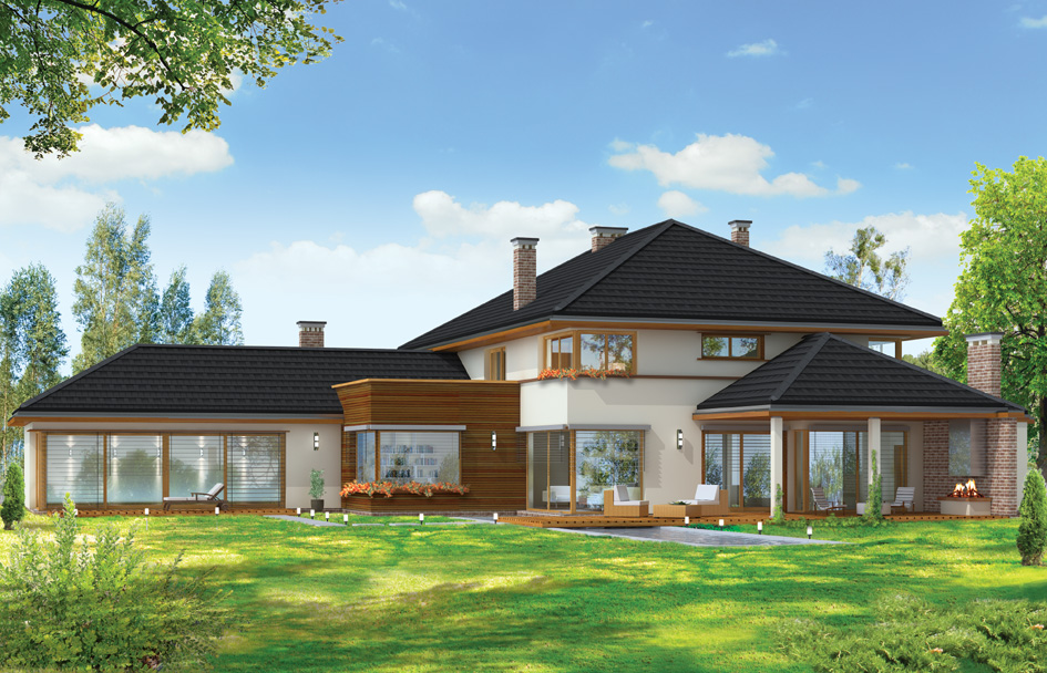 Villa with pool is a large residence for a family of four-of six people. House consists of a compact, one-storey body covered by a hipped roof, built-on two blocks, covered by a hipped roofs. Building is a suburban villa with modern but quiet architecture. Design of the house is interesting thanks to build another garage, large roofed arcade and separate room at the back of the villa. Body of the building has been interestingly decorated by clinker and wooden cladding elevation, loggias and entrance arcades. Massive ornate chimney of internal and external fireplace, and corner windows are additional decorations of solid. On the ground floor for by a vide glazing from living room exit to the large arcade and garden terrace was planned. All elements of the elevation form a cohesive, peaceful in composition whole. There is also available mirror version of this house plan.