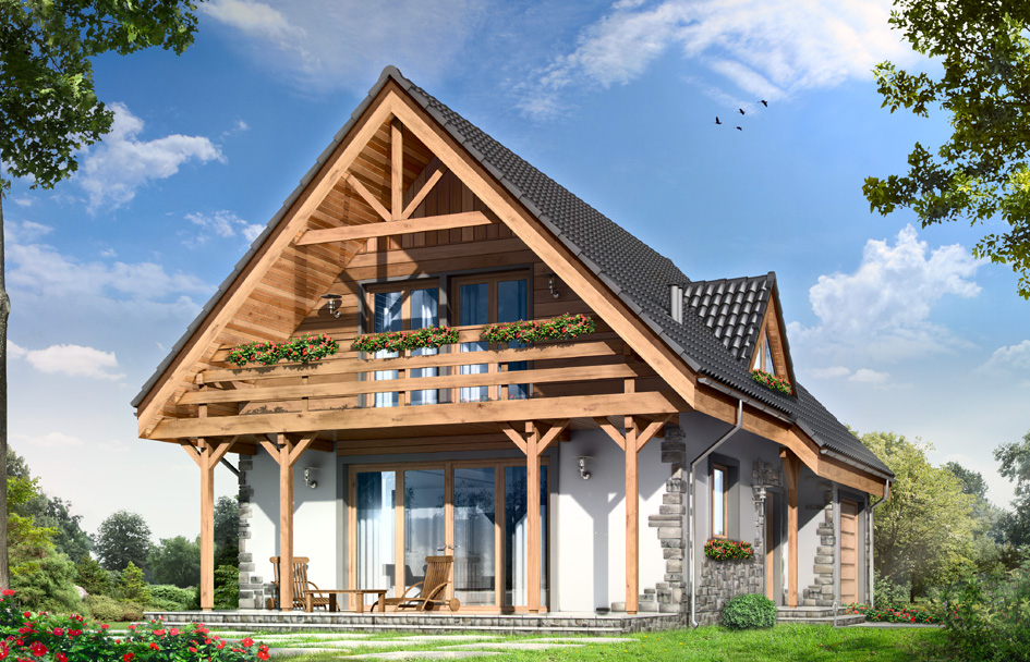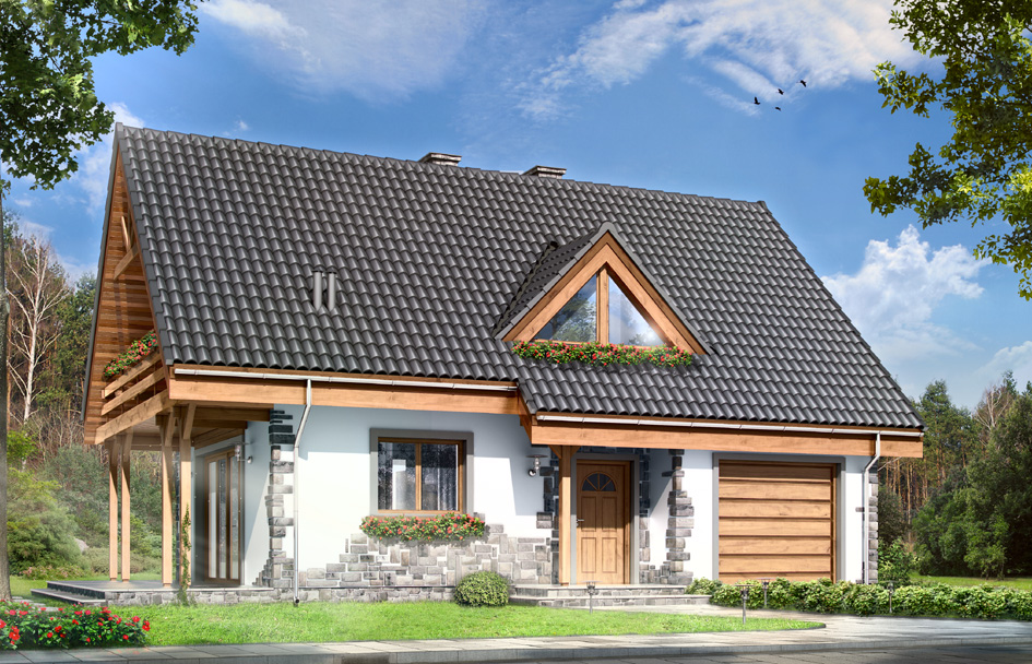 Wiselka house plan is a storey house with usable attic, covered by gable symmetrical roof. Building is designed for a family of four-five people. The house can also be used as holiday house. Architecturally, the building refers to the southern Polish regions. Wood finishes of peaks of the house, columns with struts, balcony, stone facade cladding - all these elements bring to mind the Podhalanski style. At the same time the inspiration is so delicate that the house will not look strangely built in Mazury, Silesia and Mazovia. Wiselka interior is divided into a living area on the ground floor and bedrooms in the attic. On the ground floor was designed a living room combined with an open kitchen and hall, and a beautiful large glass exit to partly covered terrace and garden. In a central location was placed fireplace and stairs to the top. In addition, on the ground floor provides garage and boiler room. In the attic there are there are three bedrooms and a bathroom. There is also available mirror version of this house plan and variant version with an extra room instead of garage.
