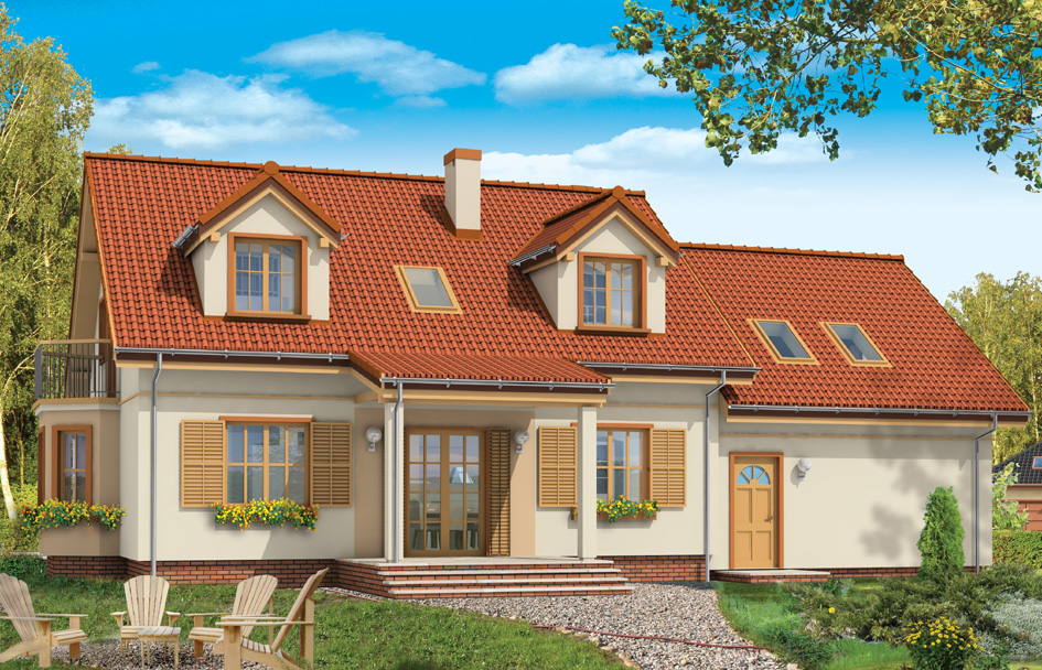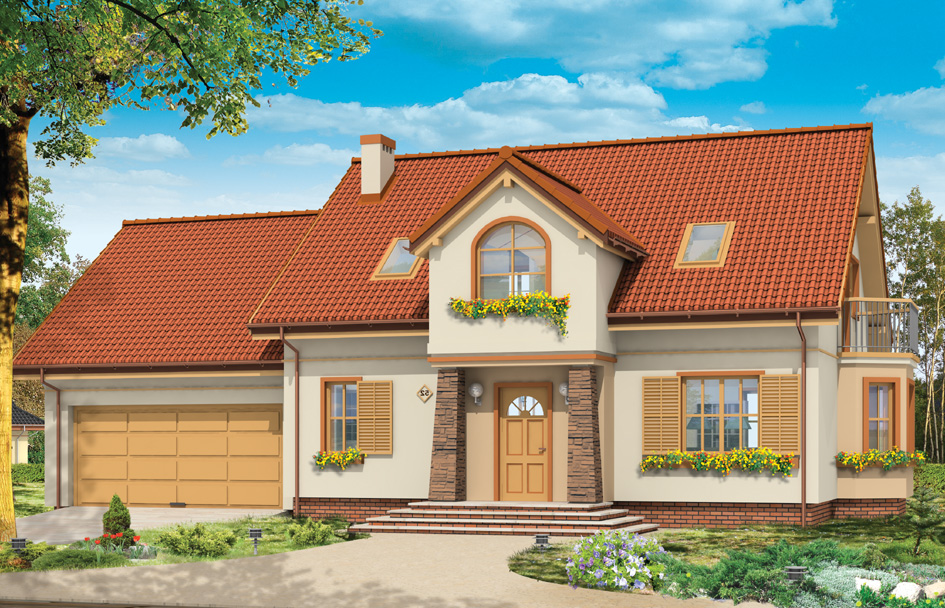 Natty 5 is variant version of one of the most popular projects of our stuido i.e. Natty house plan. This house plan has a garage for two cars and an extensive residential part. On the ground floor is designed living room with dining area, kitchen, and an additional room - a bedroom or office. In the attic there are three spacious bedrooms with en-suite bathrooms, and a large, universal room above the garage. By raising the elbow walls in the attic rooms are larger. Dormers allowed placement the windows in each room. The house is a reasonable proposition for a family of 4 to 6 people. You can also live in this house with your grandparents. Large garage with utility room is an additional advantage of this project. You can also order a mirror version of this house plan.